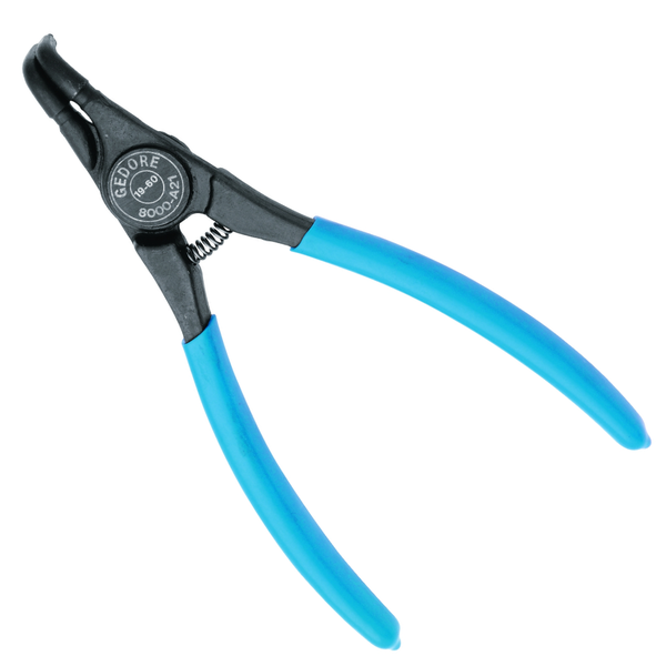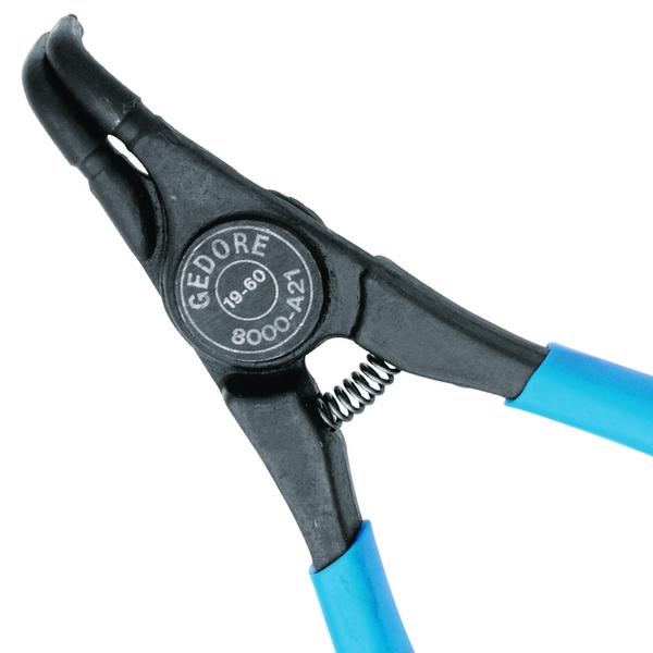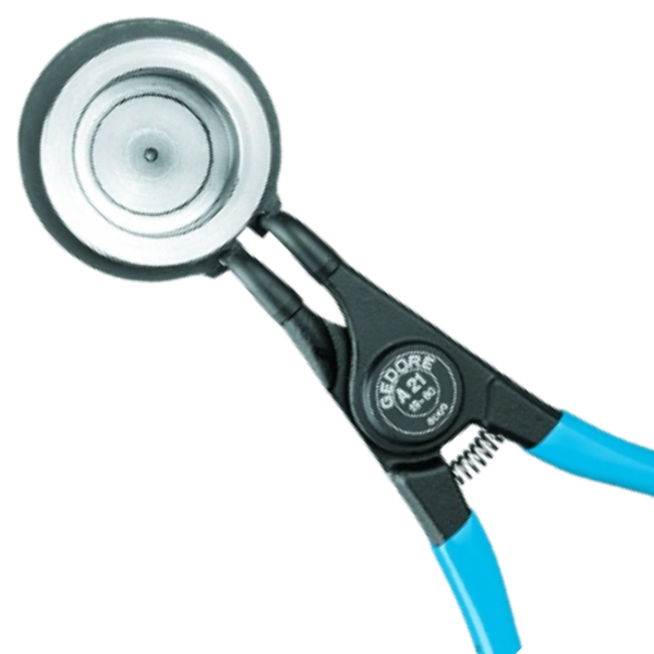 -Aco Gedore-Vanadium. Fosfatizado e cabos plastificados. -Alicate com pontas fixas e curvas. Para aneis de seguranca externos conforme Norma DIN 471 e DIN 983.