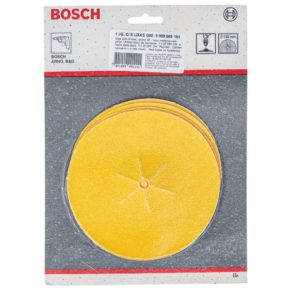* Especifica????es t??cnicas do fabricante.- Lixar madeira em geral.- Di??metro total: 130mm.- Di??metro do furo: 6mm.- Para todas as furadeiras.- Gr?#o: 80.
